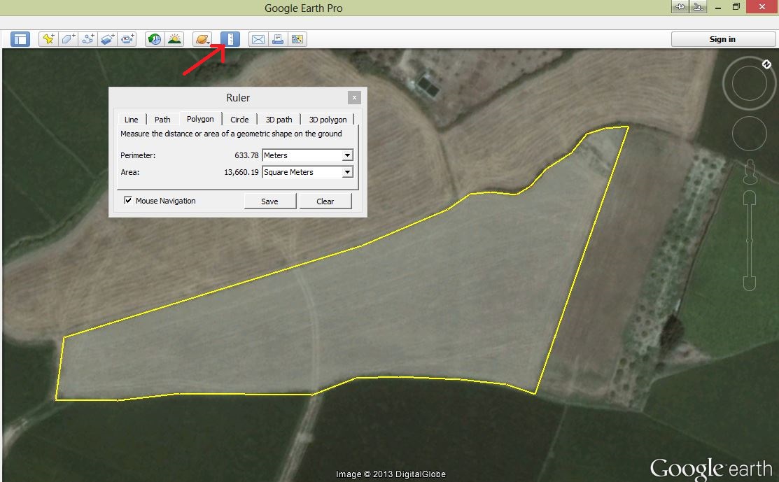 روش 1) به طور حتم اسم نرم افزار Google earth برای همه کاربران آشنا است. با استفاده از قابلیتی که در نسخه Professional این نرم افزار موجود است می توانید به راحتی مساحت، طول و محیط را محاسبه کنید. پس از دانلود (لینک دانلود)، نصب و اجرای Google Earth Pro، در محیط نرم افزار با انتخاب گزینه خط کش (Ruler)، پنجره ای باز میشود که از 4 سربرگ تشکیل شده است. "Line" و "Path" و "Polygon" و "Circle"